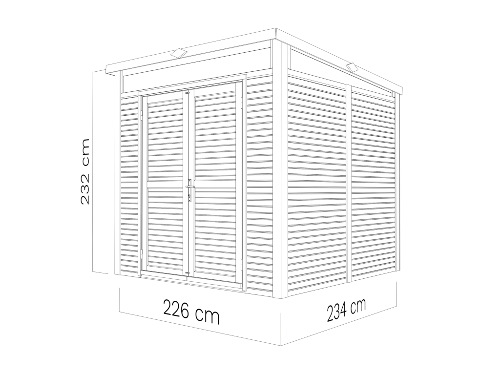 Het grondoppervlak van dit tuinhuis is 5,11 m². De funderingsmaat bedraagt 226 x 234 cm (B x D). Dankzij de nokhoogte van 232 cm benut je de ruimte binnen optimaal.
