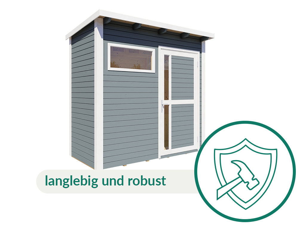 Een modern lessenaarsdak van massief hout met mes-en-groefverbinding geeft dit tuinhuis een stijlvolle, elegante look. Doordat het dak slechts één aflopende dakvlak heeft, blijft de binnenruimte optimaal bruikbaar en verlies je nauwelijks nuttige ruimte. Bovendien kan regenwater via de hellende zijde van het lessenaarsdak goed weglopen en is er slechts één regengoot nodig.