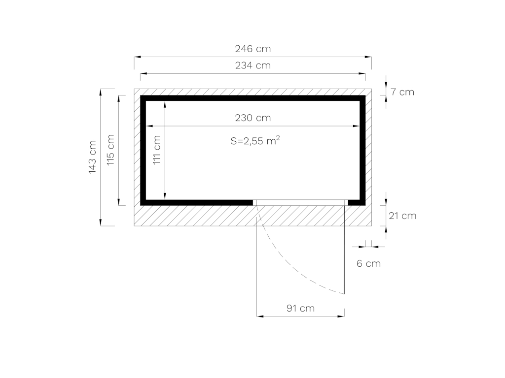 De grondoppervlak van dit tuinhuis is 2,69 m². De funderingsmaat (huis zonder aanbouw) is 234 x 115 cm (B x D). De funderingsmaat is 234 x 115 cm (B x D). Dankzij de nokhoogte van 232 cm benut je de binnenruimte optimaal.