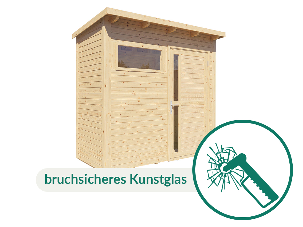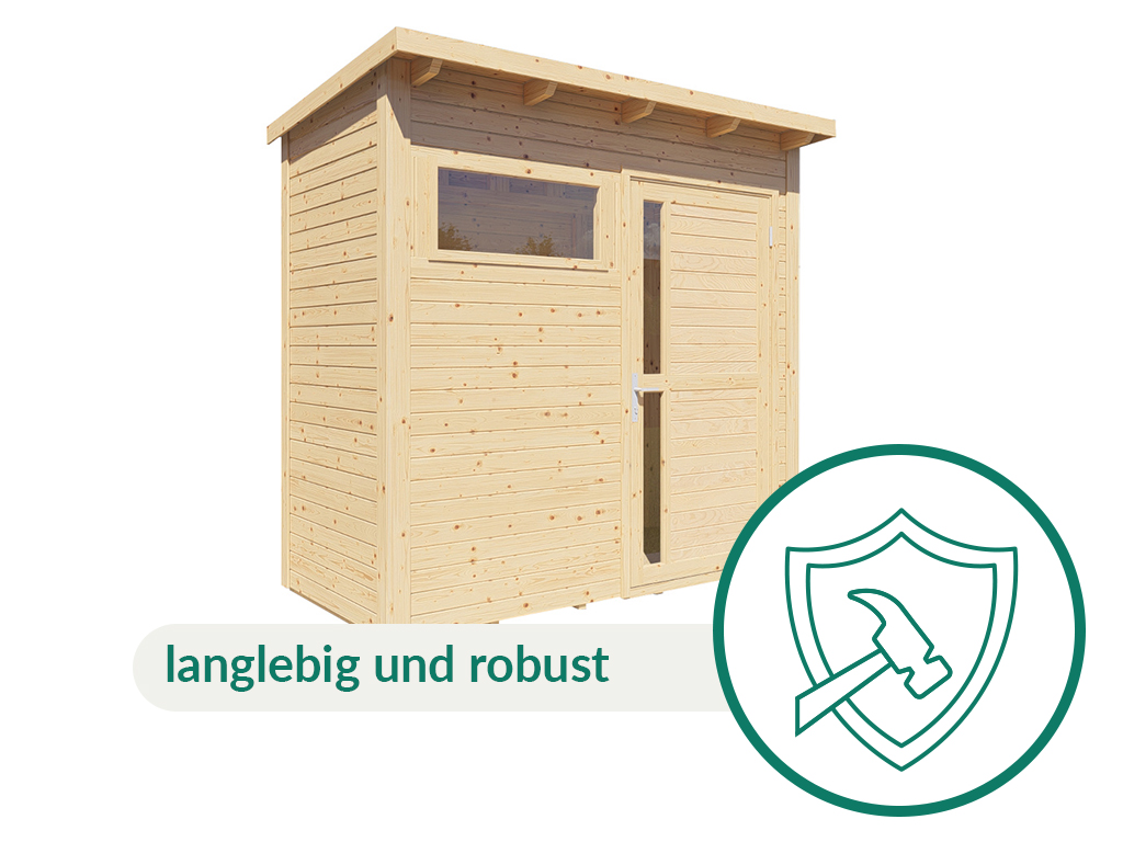 Het moderne lessenaarsdak van massief hout met mes-en-groefverbinding geeft dit tuinhuis een stijlvolle, elegante uitstraling. Doordat het dak uit één hellend vlak bestaat, blijft de bruikbare ruimte binnen vrijwel volledig behouden en gaat er weinig nuttige hoogte verloren. Bovendien zorgt de helling van het lessenaarsdak voor een goede afvoer van regenwater en is slechts één dakgoot nodig.