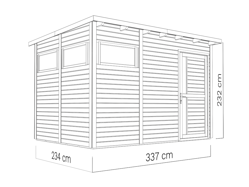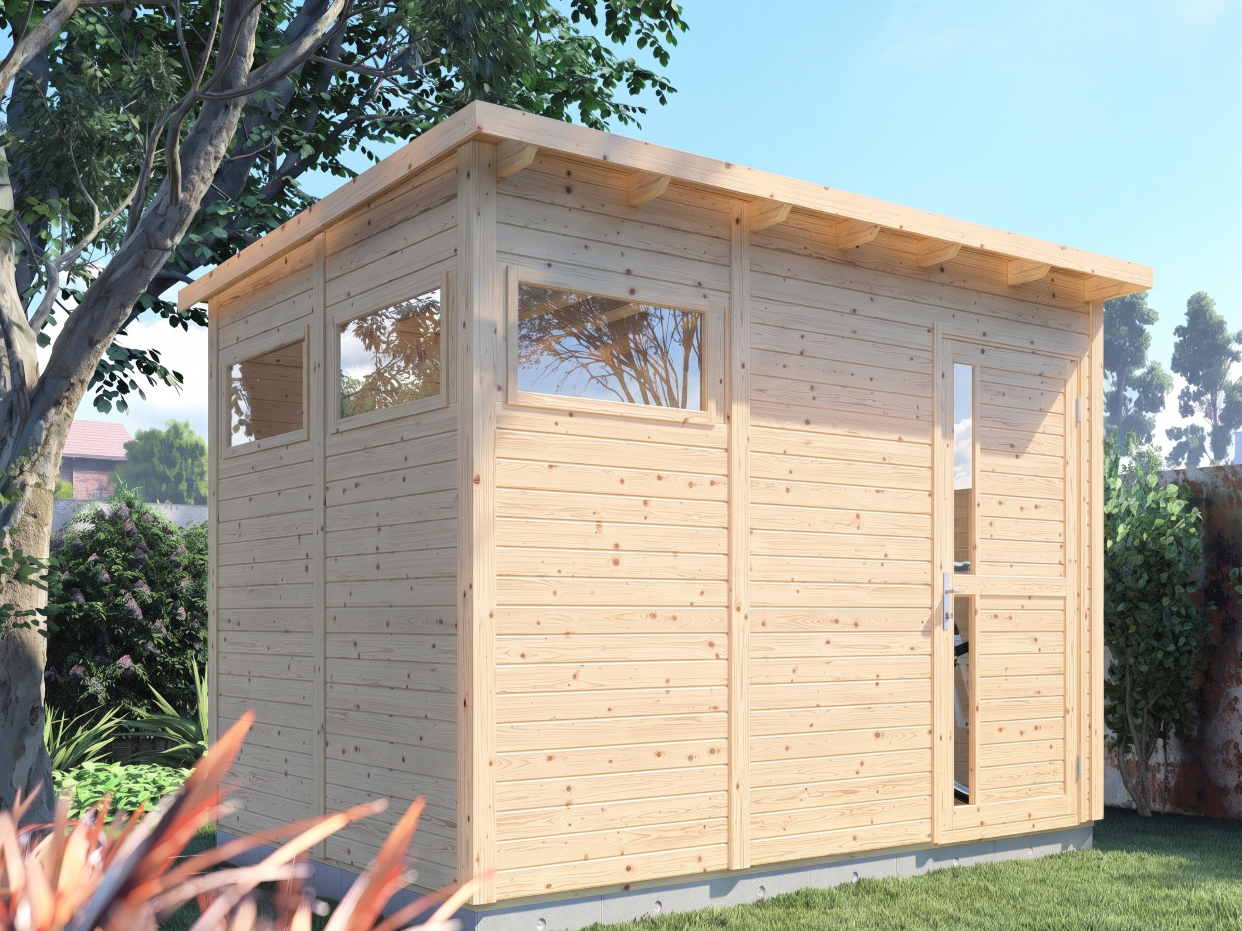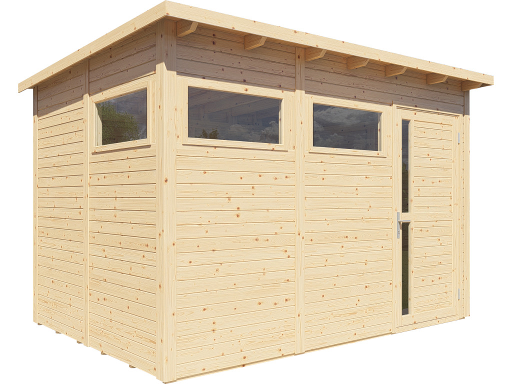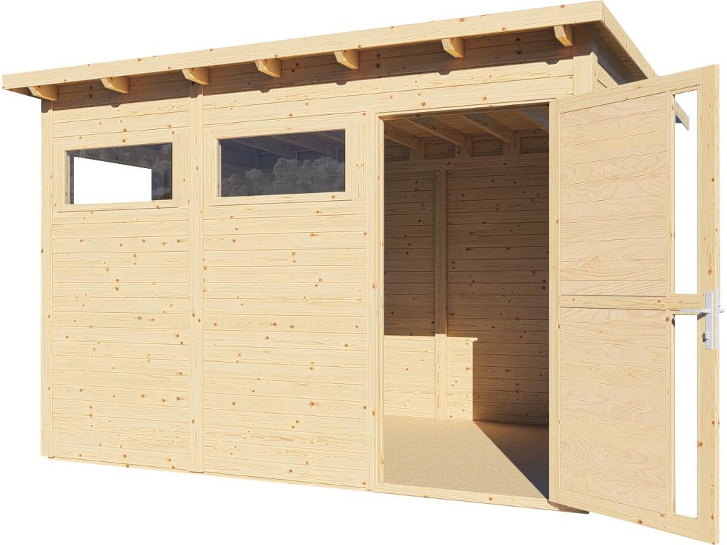 Het moderne lessenaarsdak van massief hout met Mes-en-groefverbinding geeft dit tuinhuis een strakke, elegante uitstraling. Doordat het dak uit één hellend vlak bestaat, blijft de bruikbare ruimte binnenin vrijwel volledig behouden en gaat er weinig nuttige hoogte verloren. De helling van het lessenaarsdak zorgt bovendien voor een goede afvoer van regenwater, waardoor je maar één dakgoot hoeft te monteren.