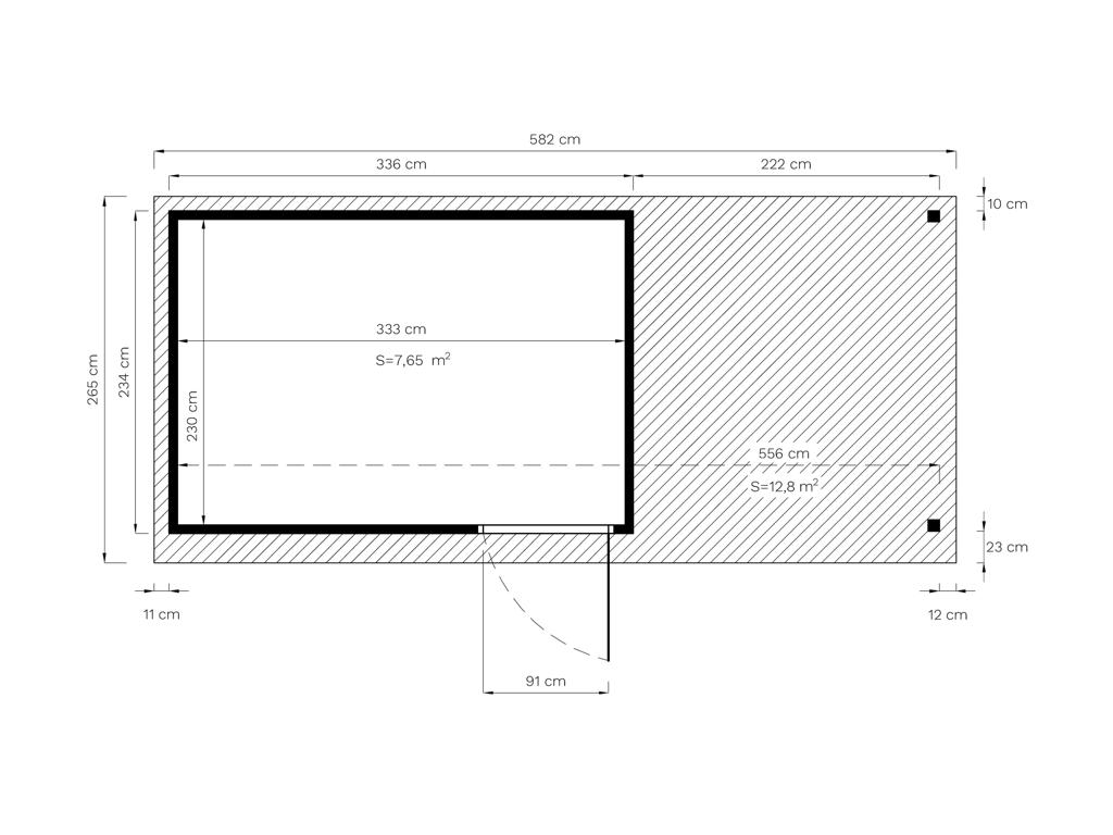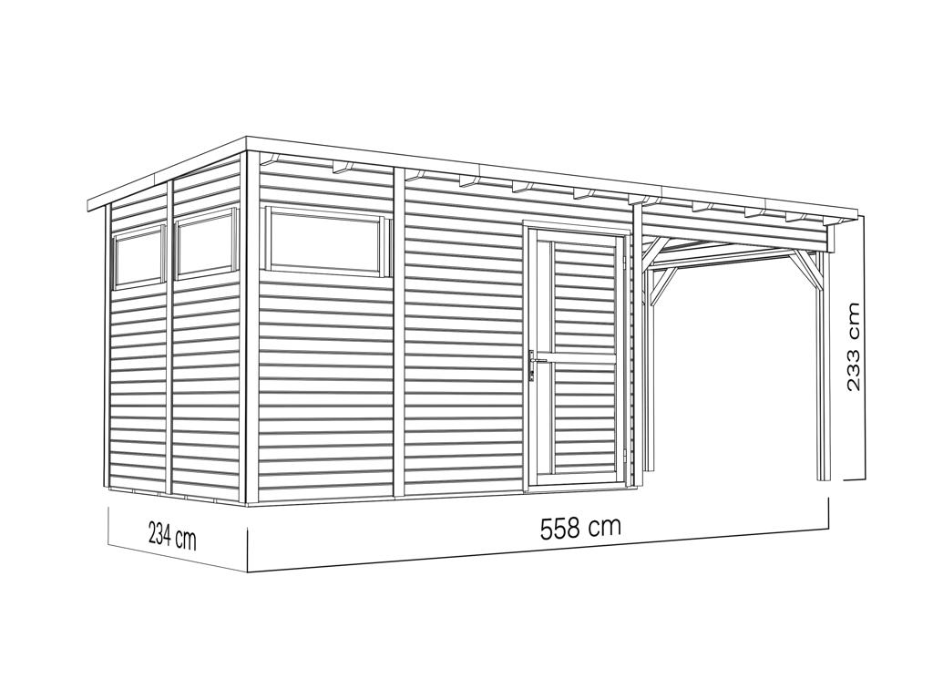 B x D x H: 582 x 265 x 233 cm, sokkelmaat huis: 336 x 234 cm, incl. 2,2 m aanbouw + vloer