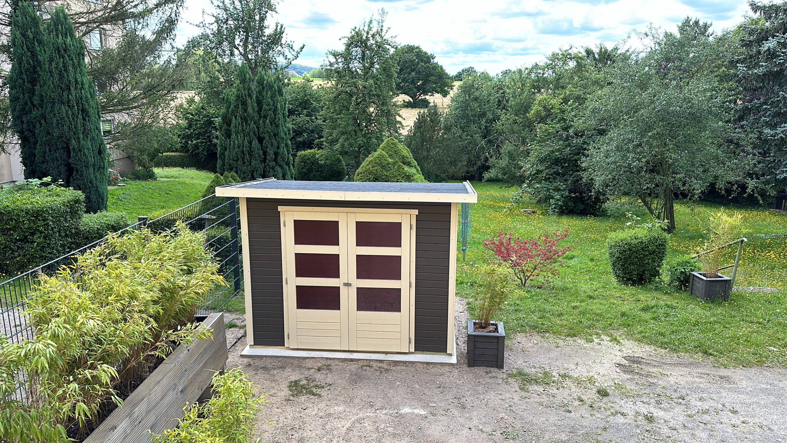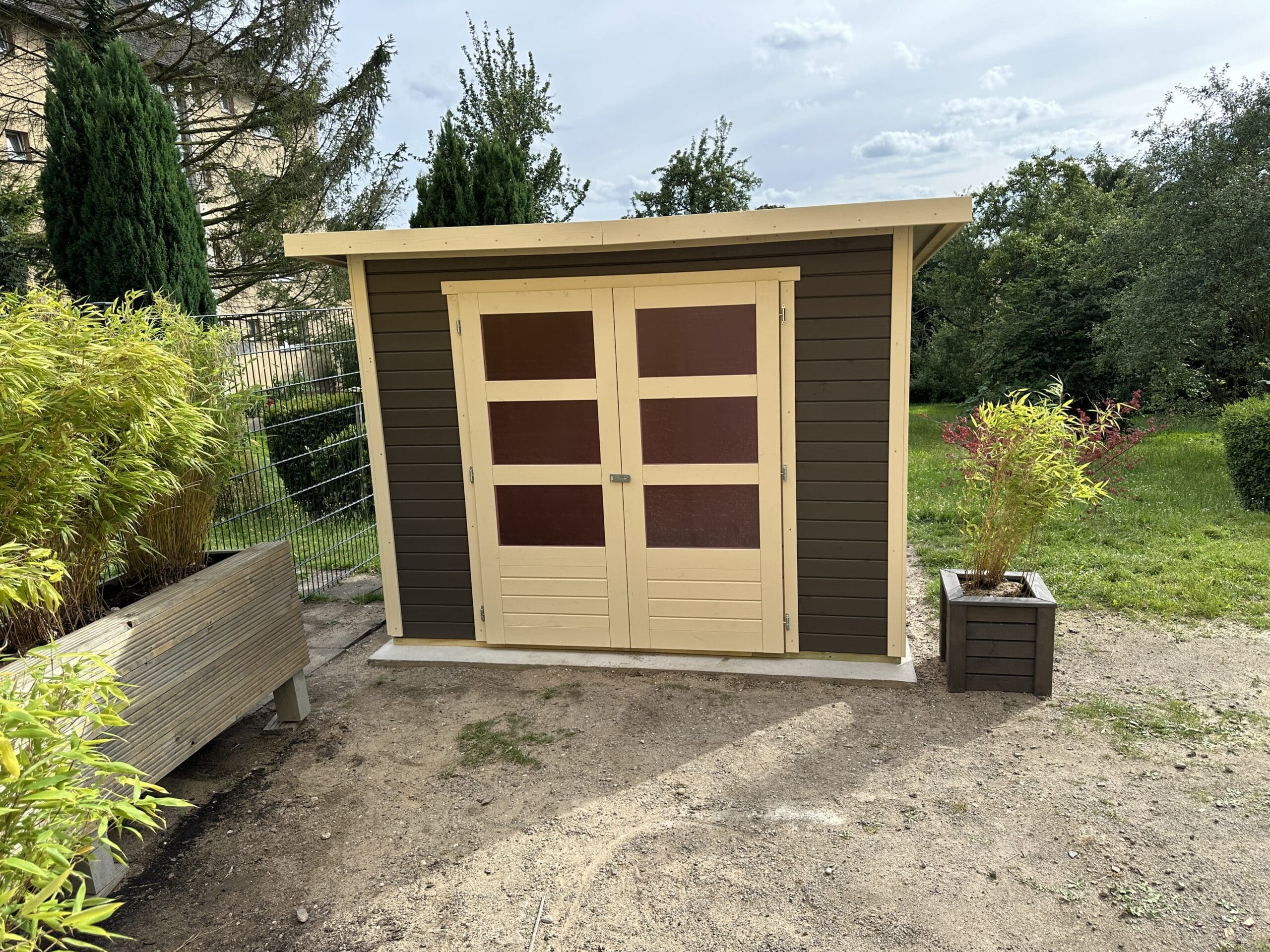 Ruim tuinhuis met dubbele vleugeldeur en modern lessenaarsdak.