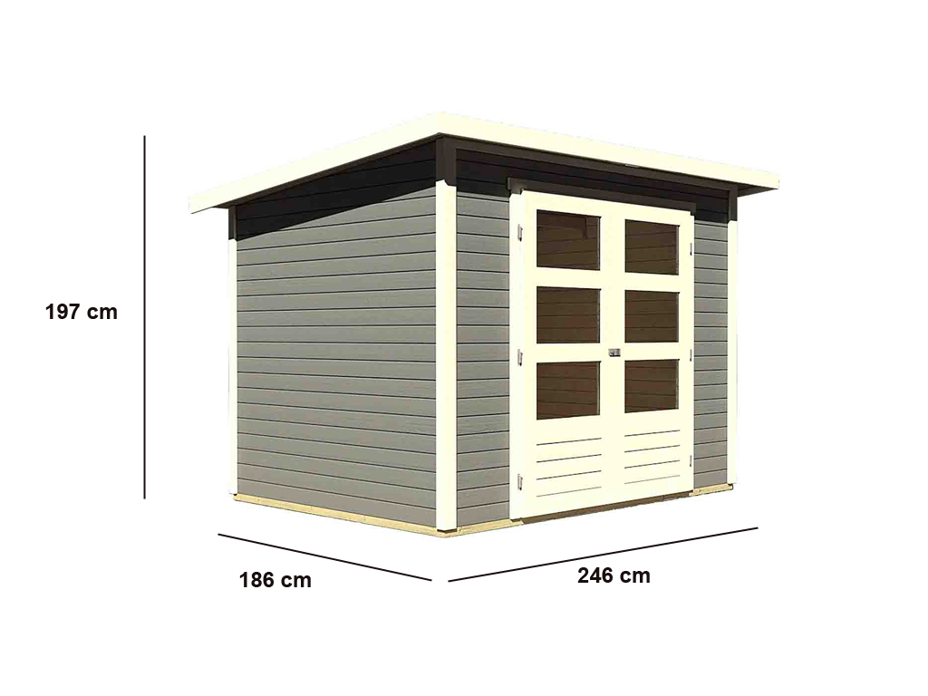 B x D x H: 246 x 186 x 197 cm, Basisafmeting huis: B x D: 242 x 182 cm, incl. Dubbele vleugeldeur met lichtuitsparingen