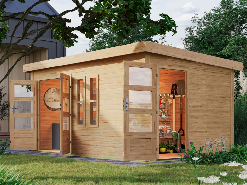 De grondoppervlakte van het tuinhuis bedraagt 11,48 m². Een optimale ruimtebenutting wordt gegarandeerd dankzij een nokhoogte van 228 cm.