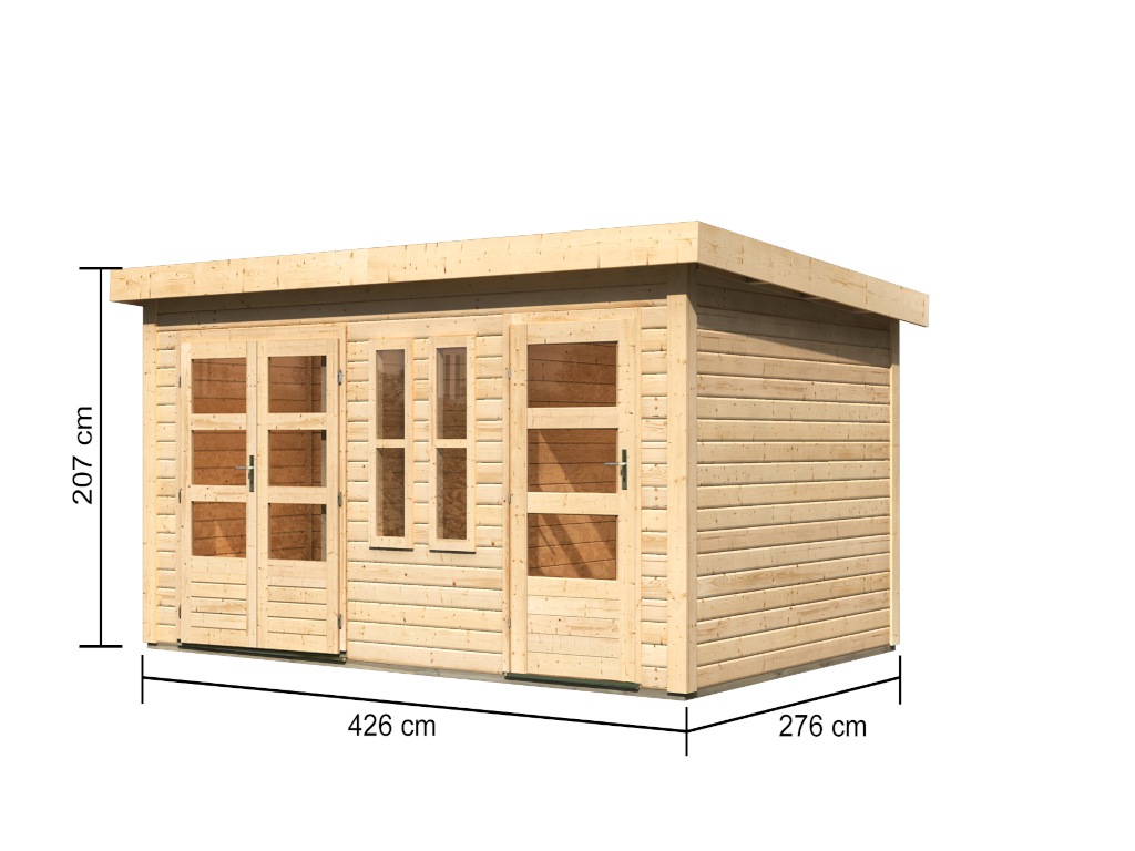 B x D x H: 426 x 276 x 228 cm, funderingsmaat huis: B x D: 422 x 272 cm
