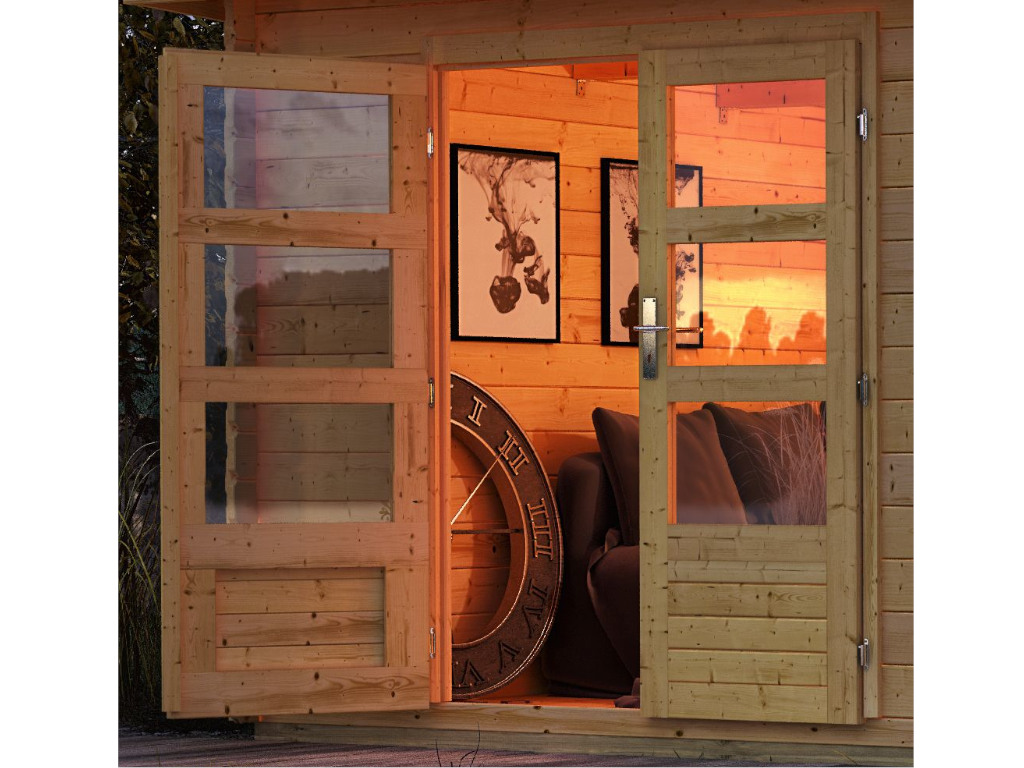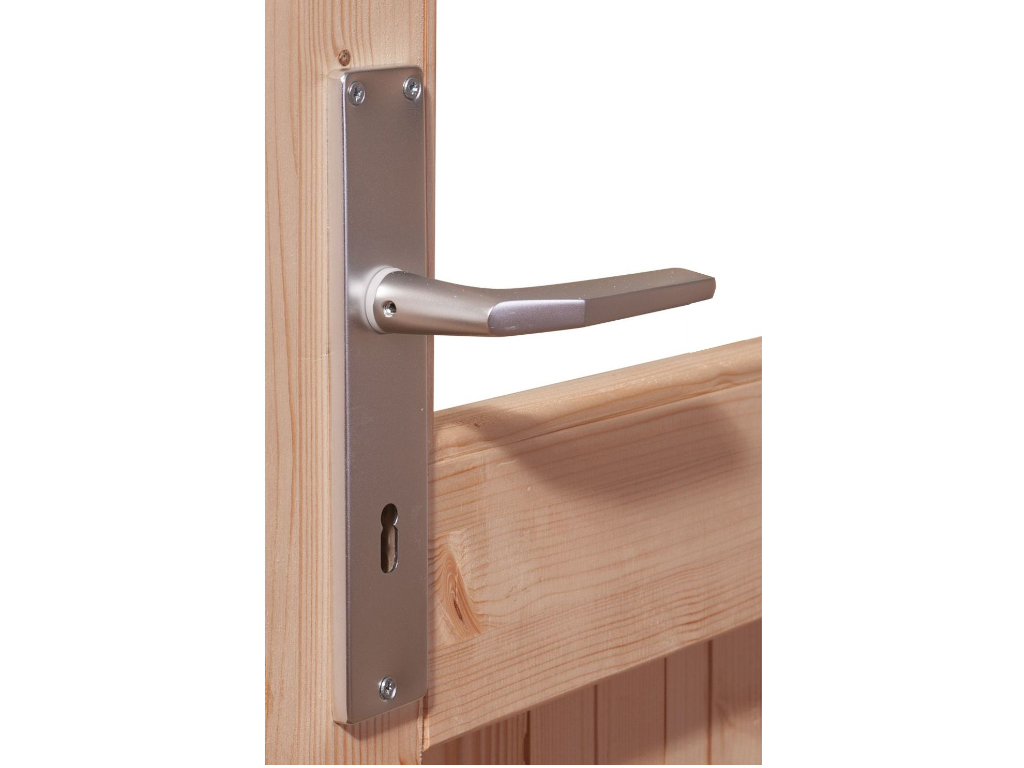 De praktische en voorgemonteerde deur, met zijn royale afmetingen en massief houten frame, zorgt voor een gemakkelijke toegang tot het tuinhuis en beschermt ook effectief de toegang tegen onbevoegden. - Beglazing