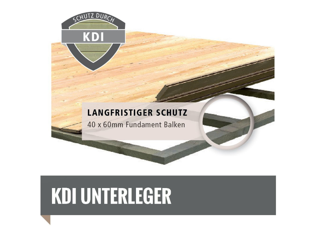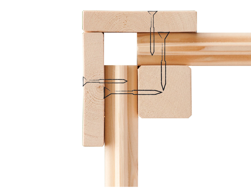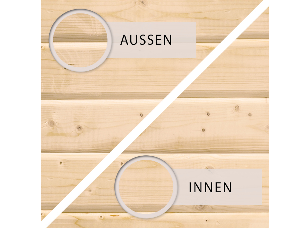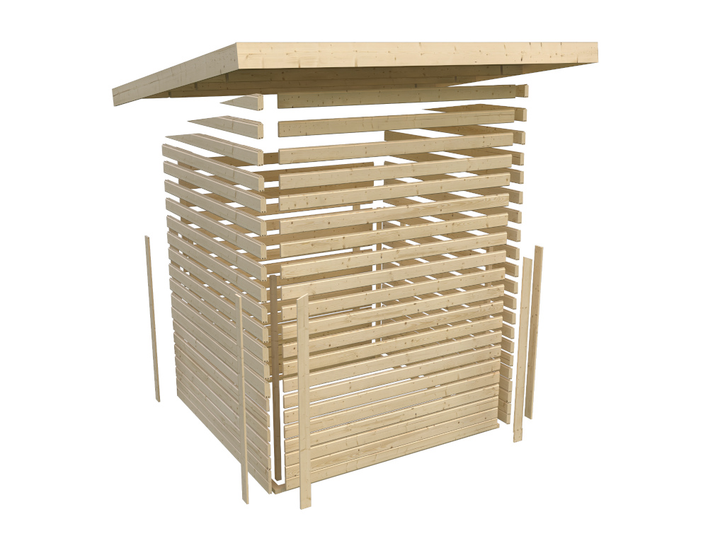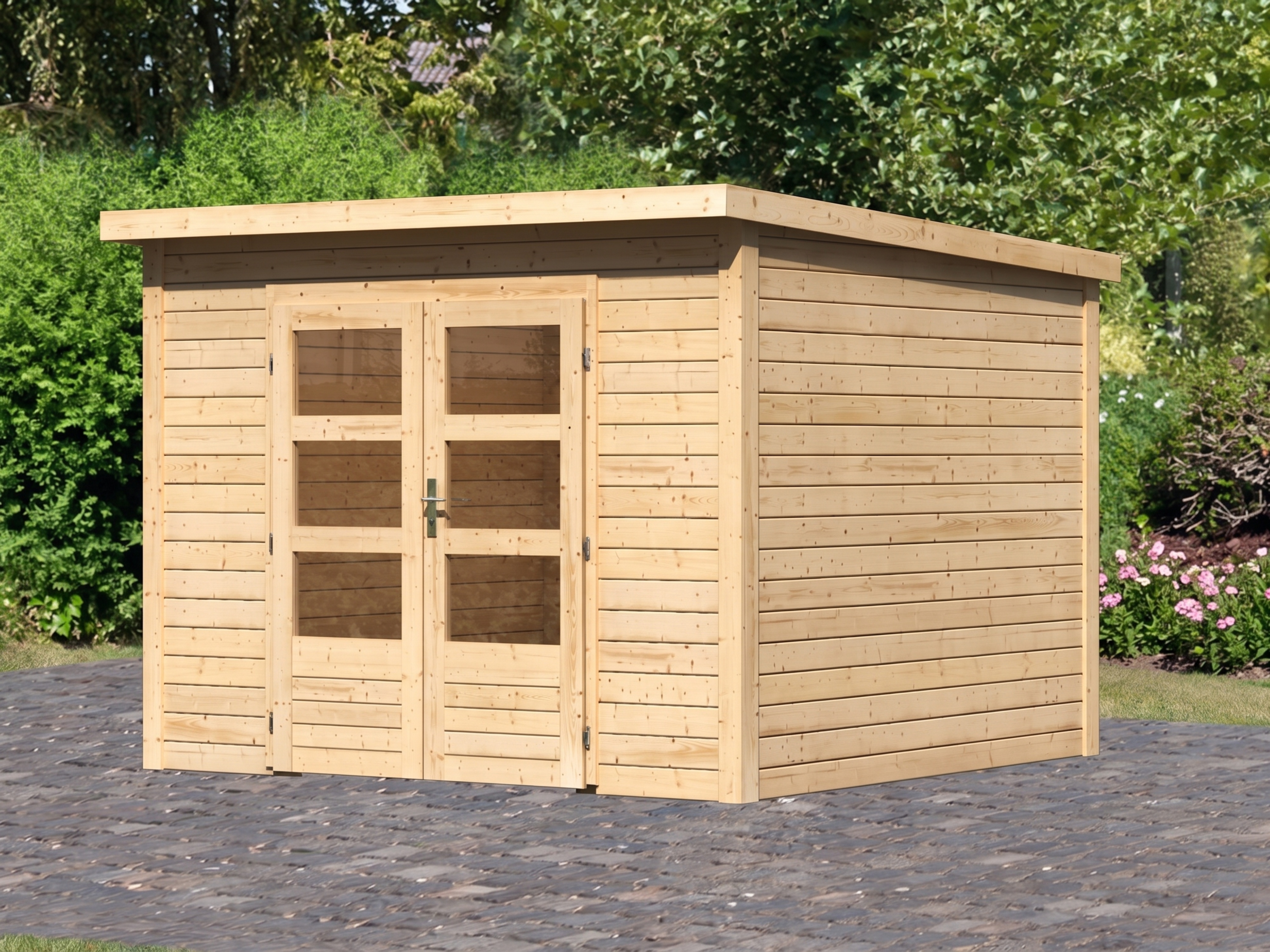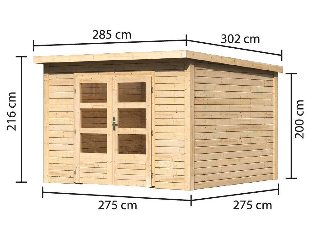 Het tuinhuis is gemaakt van 28 mm dikke wandplanken van Scandinavisch sparrenhout in een steek-/schroefsysteem en zorgt zo voor een eenvoudige montage en een stabiele constructie. Het vloeroppervlak bedraagt 7,29 m² met een afgesloten ruimte van 14,6 m³. Met een zijhoogte van 200 cm en een nokhoogte van 216 cm biedt het tuinhuis een optimaal ruimtegebruik. Het tuinhuis zonder aanbouw heeft een basisafmeting van 270 cm x 270 cm. Vloerbalken zorgen voor bescherming van onderaf en worden onder het tuinhuis geplaatst. - Dak