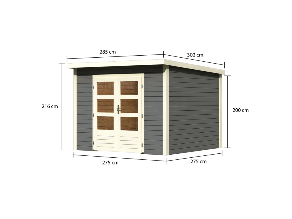 B x D x H: 285 x 302 x 216 cm, funderingsmaat huis: B x D: 270 x 270 cm, incl. dubbele deur met lichtstroken