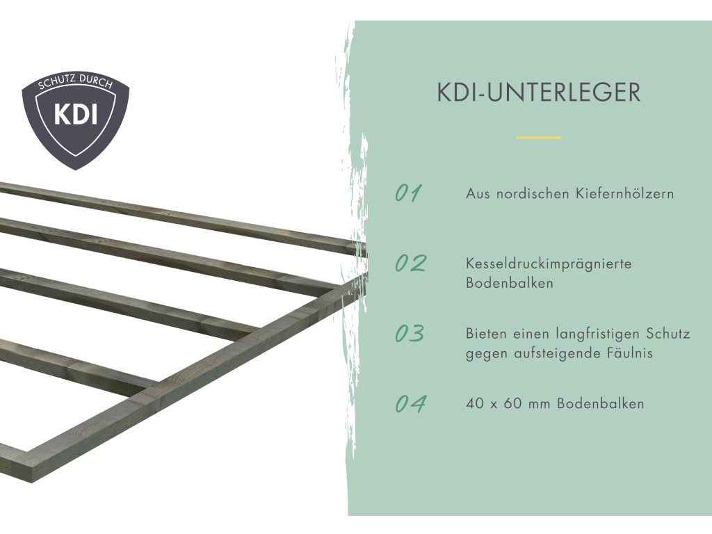 Dit tuinhuis wordt geleverd inclusief geïmpregneerde onderconstructie en montagemateriaal. Deze fungeert als draagconstructie, vormt een solide basis en zorgt voor de benodigde stabiliteit. De onder druk geïmpregneerde onderconstructie is bijzonder goed bestand tegen weersinvloeden, houtrot, insecten, schimmel en zwammen. Ze is onderhoudsarm, duurzaam en geschikt voor alle ondergronden.
