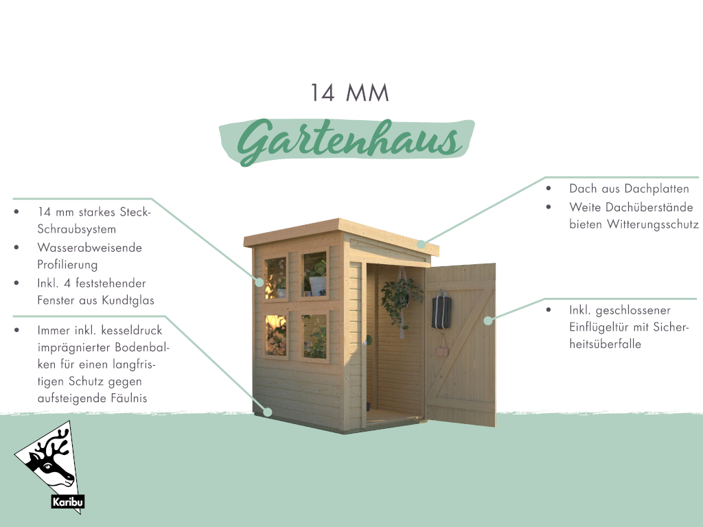 Met een wanddikte van 14 mm is dit tuinhuis ideaal als stallingsplek voor fietsen, tuingereedschap en toebehoren. De lichte, eenvoudige constructie is snel te monteren en biedt voldoende bescherming als overkapping of berging.