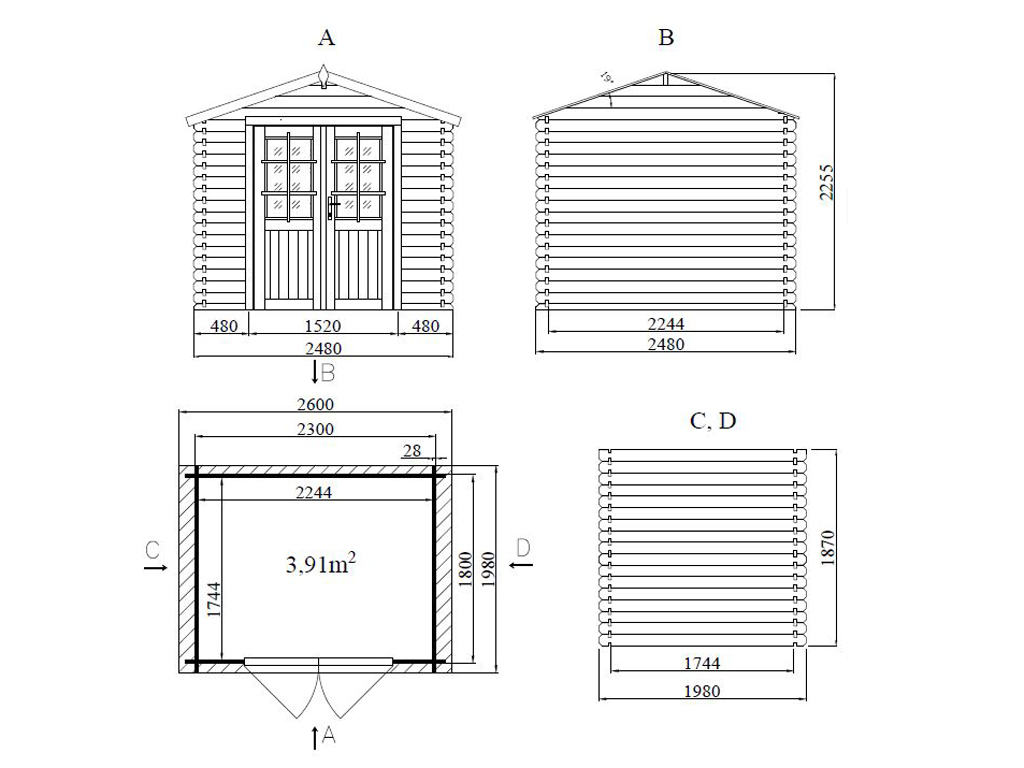 Het grondoppervlak van het tuinhuis is 5,15 m² met een basisafmeting van 227,2 x 177,2 cm (B x D). Door een nokhoogte van 225 cm is een optimale benutting van de ruimte gegarandeerd.