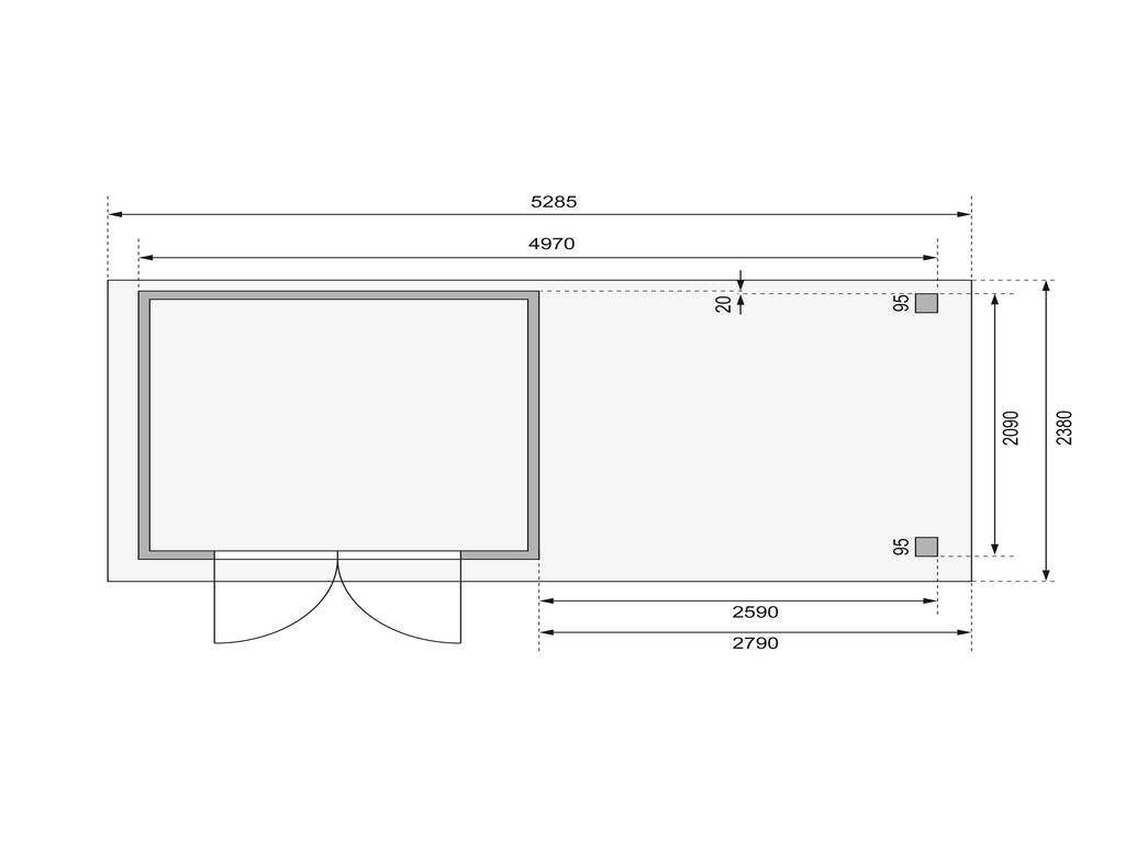 B x D x H: 529 x 238 x 211 cm, sokkelafmetingen huis: B x D: 238 x 213 cm, incl. 2,8 m aanbouwdak met achterwand