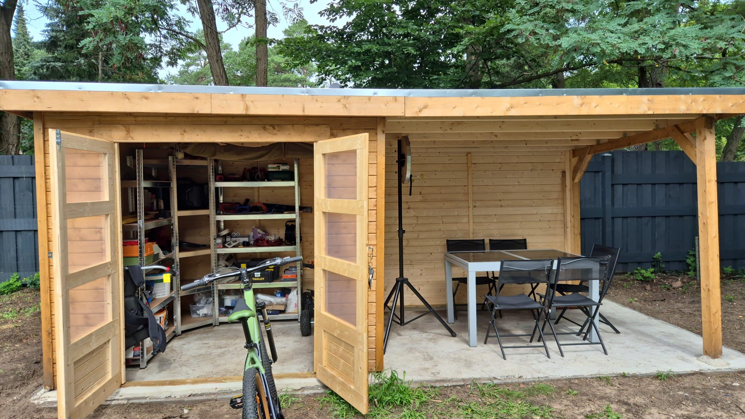 Dit tuinhuis met aangebouwde overkapping en achterwand is zeer veelzijdig inzetbaar. De extra opbergruimte die ontstaat door de overkapping is ideaal als opbergruimte voor tuinspullen of als zithoek om te relaxen. Dankzij de overkapping en de geïntegreerde achterwand zijn gereedschappen en tuinmeubelen optimaal beschermd tegen weer en wind.