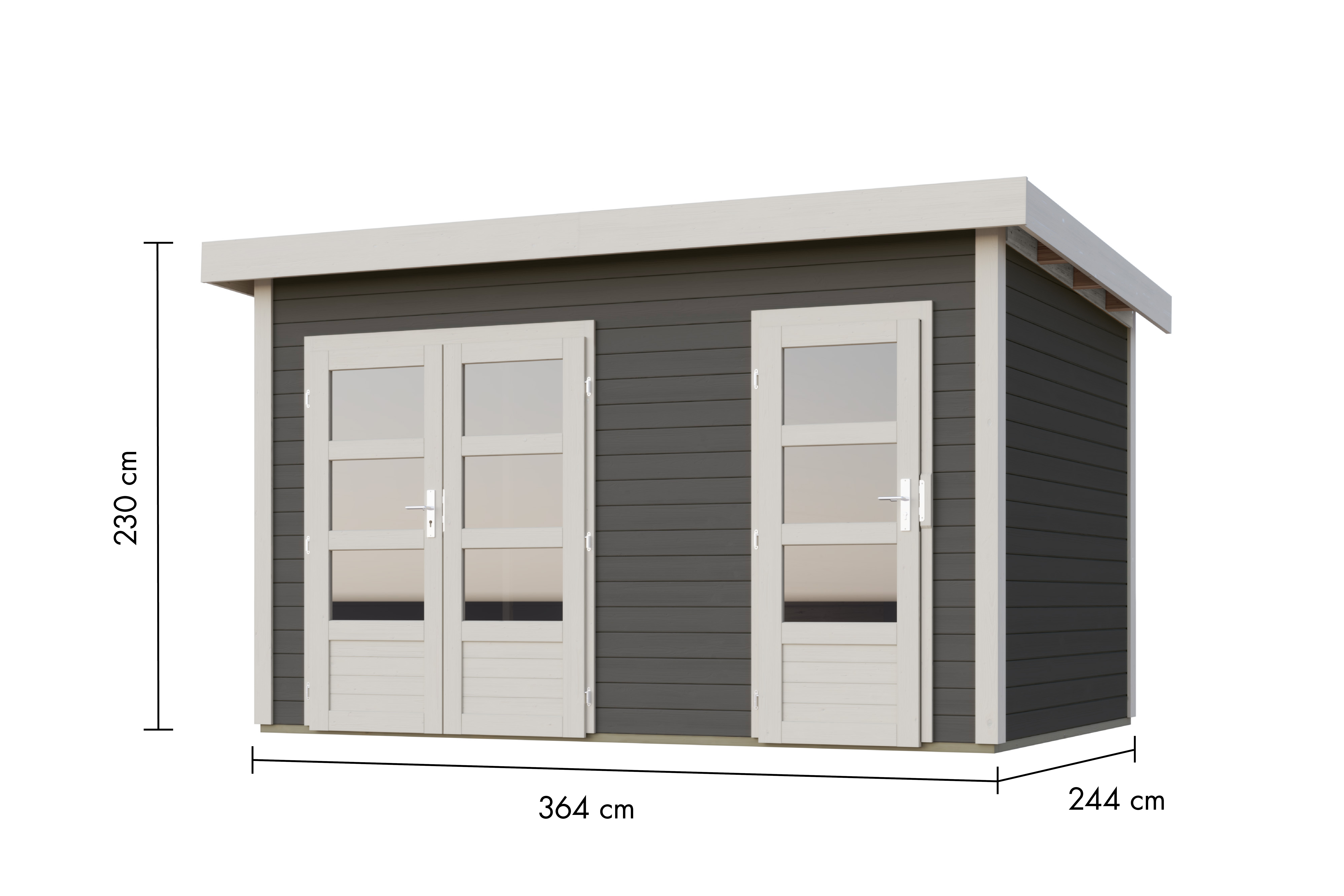 B x D x H: 396 x 273 x 230 cm, basismaat: B x D: 360 x 240 cm, incl. dubbele vleugeldeur + enkele vleugeldeur