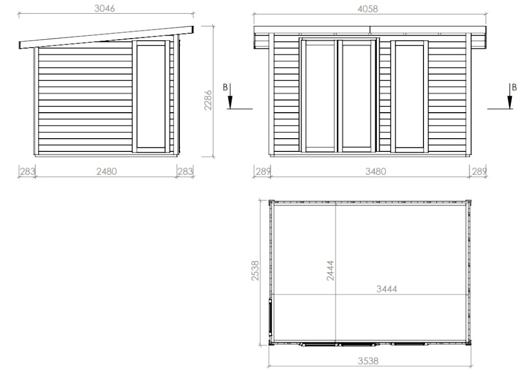 | Buitenmaten met dakoverstek (B x D): | 405,8 x 304,6 cm |