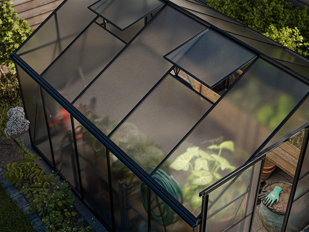 De meegeleverde dakramen voorkomen dat de warmte zich in de kas ophoopt.