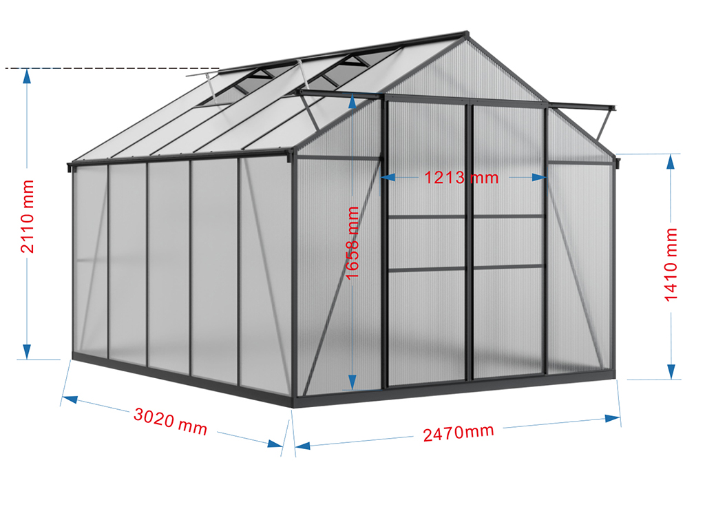 De kas is voorzien van een soepel lopende dubbele schuifdeur. Wanneer u naast de schuifdeur ook een lamellenraam plaatst, kunt u de ventilatie van de tuinkas optimaal regelen.
