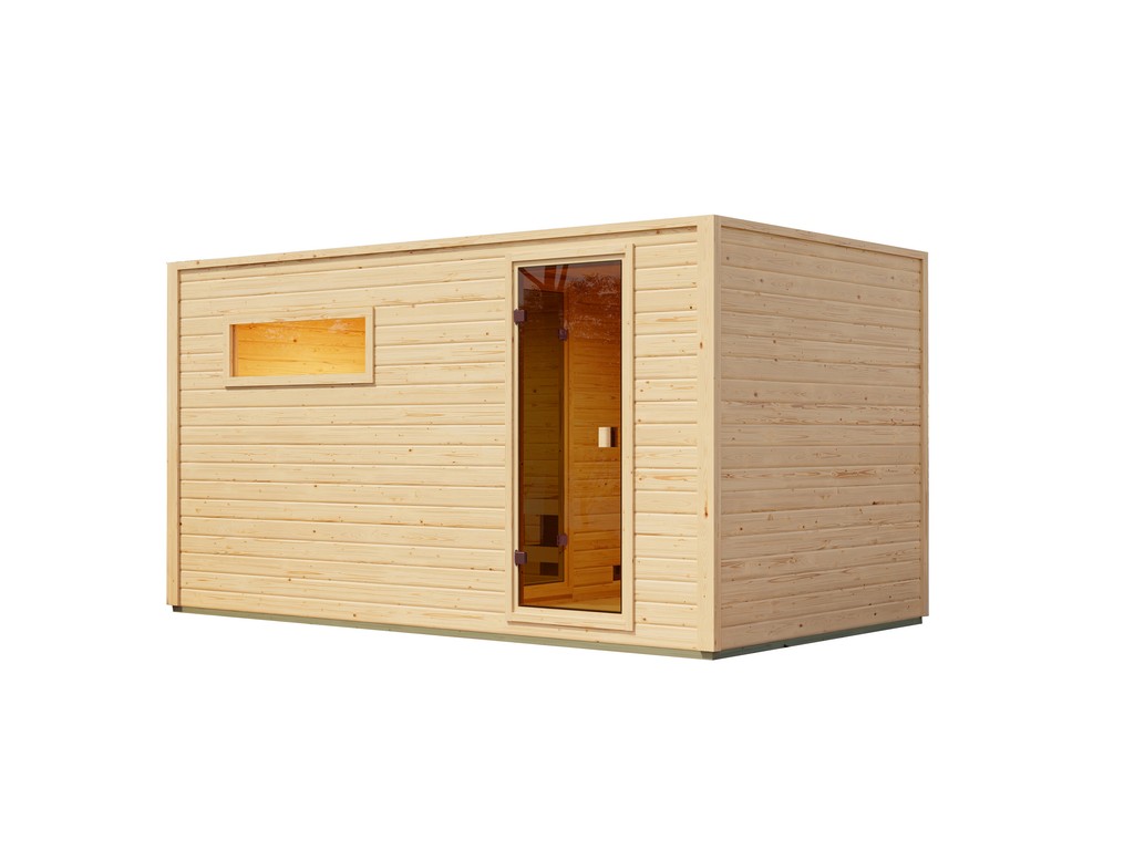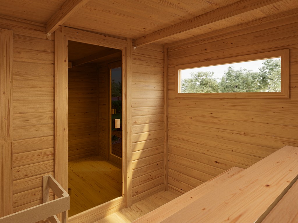 Tuinsauna Lenchen 6 naturel met voorruimte en gebronsde volledig glazen deur