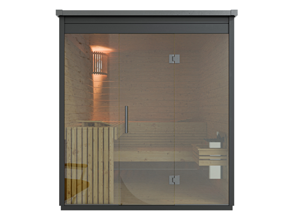 B x D x H: 196 x 196 x 221 cm, glazen front, incl. 9 kW oven met externe bediening en diabaasstenen