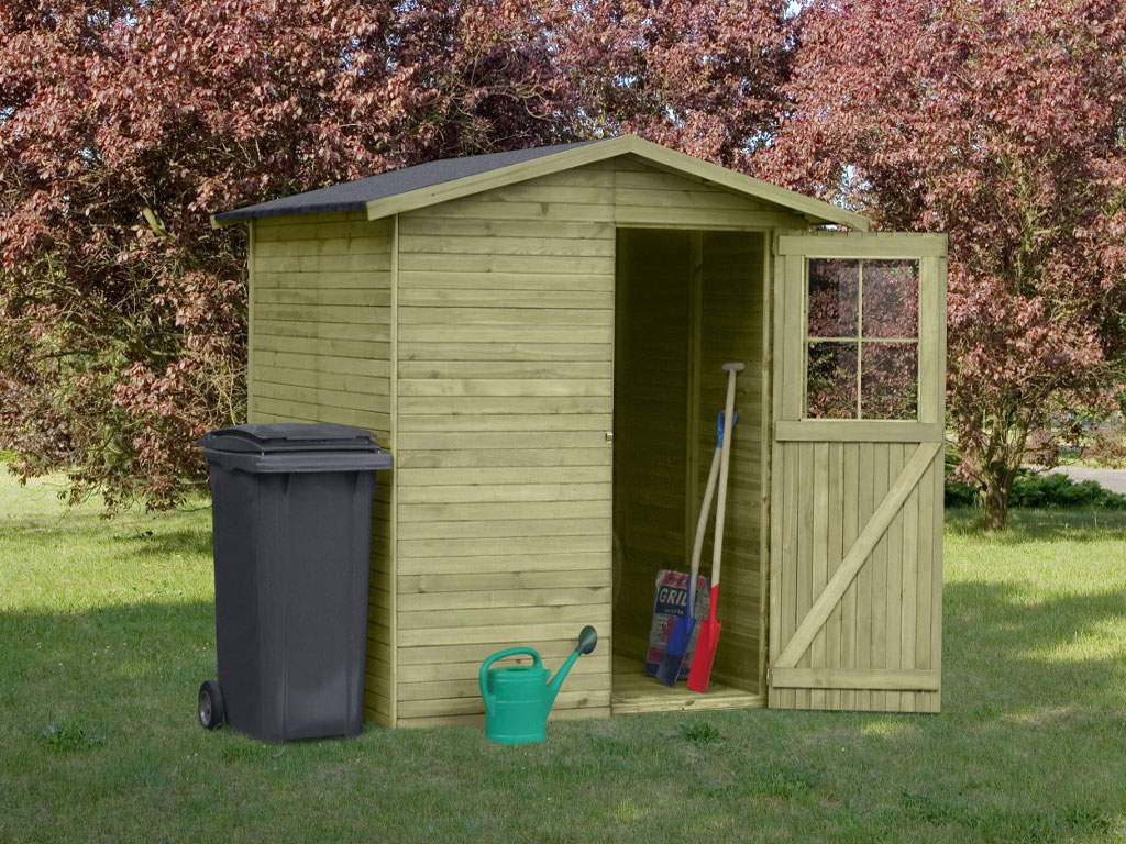 De enkele deur (B 71 x H 175,5 cm) met kunststof venster biedt voldoende ruimte om grote voorwerpen op te bergen. - Incl. vloer en dakleer
