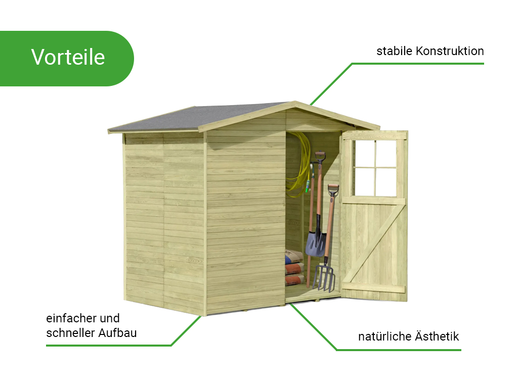 Voorgemonteerde elementen worden in elkaar gestoken en aan elkaar geschroefd. De eenvoudig te begrijpen montagehandleiding maakt een snelle en eenvoudige montage mogelijk. Extra ventilatiesleuven onder het dak zorgen voor voldoende ventilatie in de binnen - Enkele deur met lichtuitsparing
