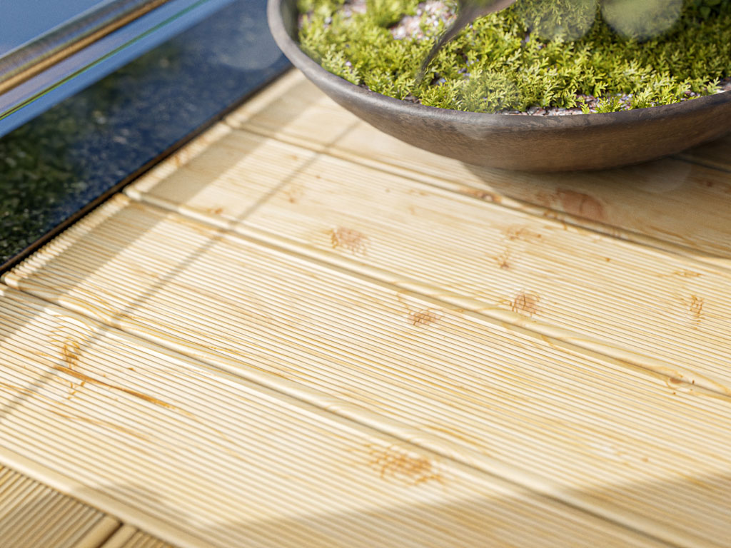 Het is belangrijk om houten planken te behandelen met natuurlijke of gekleurde gepigmenteerde oliën om ze minder gevoelig en meer bestand te maken tegen vuil en aan het weer gerelateerde schade. De grond kan met een bezem worden afgeborsteld of met water en een zachte zeep worden afgenomen Wees echter voorzichtig met hogedrukreinigers: de machine kan het hout opruwen, de beschermlaag beschadigen en zo de levensduur van de planken verkorten.