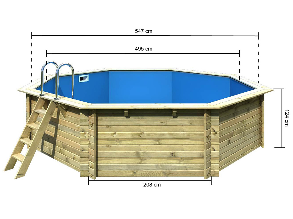 B x D x H: 547 x 547 x 124 cm, hoekverbinding met blokhutprofiel, incl. zwembadfolie, beschermvlies, terras en filterinstallatie