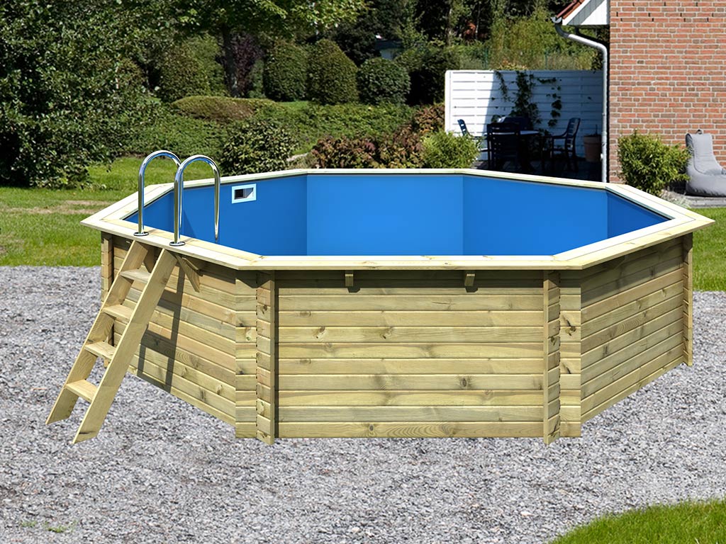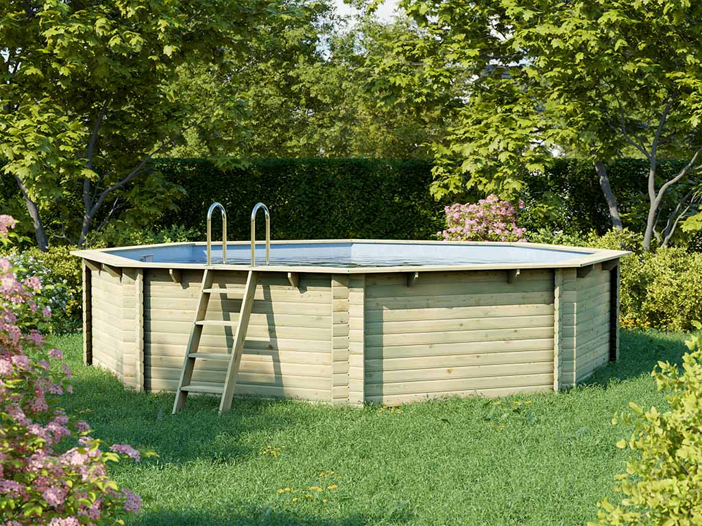 Dit achthoekige opzetzwembad met zijn houten bassinwand past zich harmonieus in het natuurlijke totaalbeeld van uw tuin in en maakt een hoogwaardige en solide indruk. Dankzij een waterdiepte van 111 cm biedt dit zwembad ruimschoots ruimte voor uiteenlopende wensen.