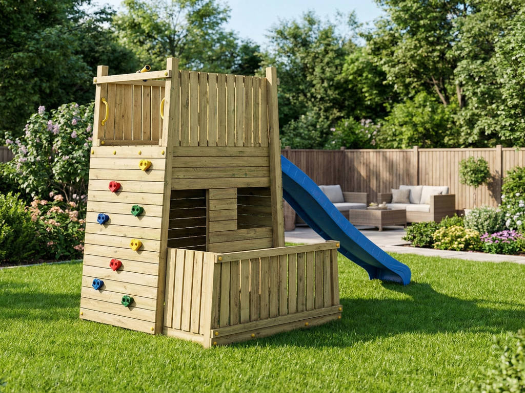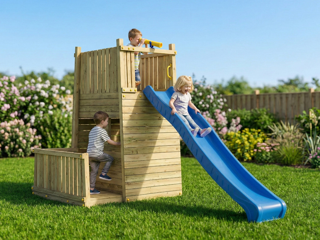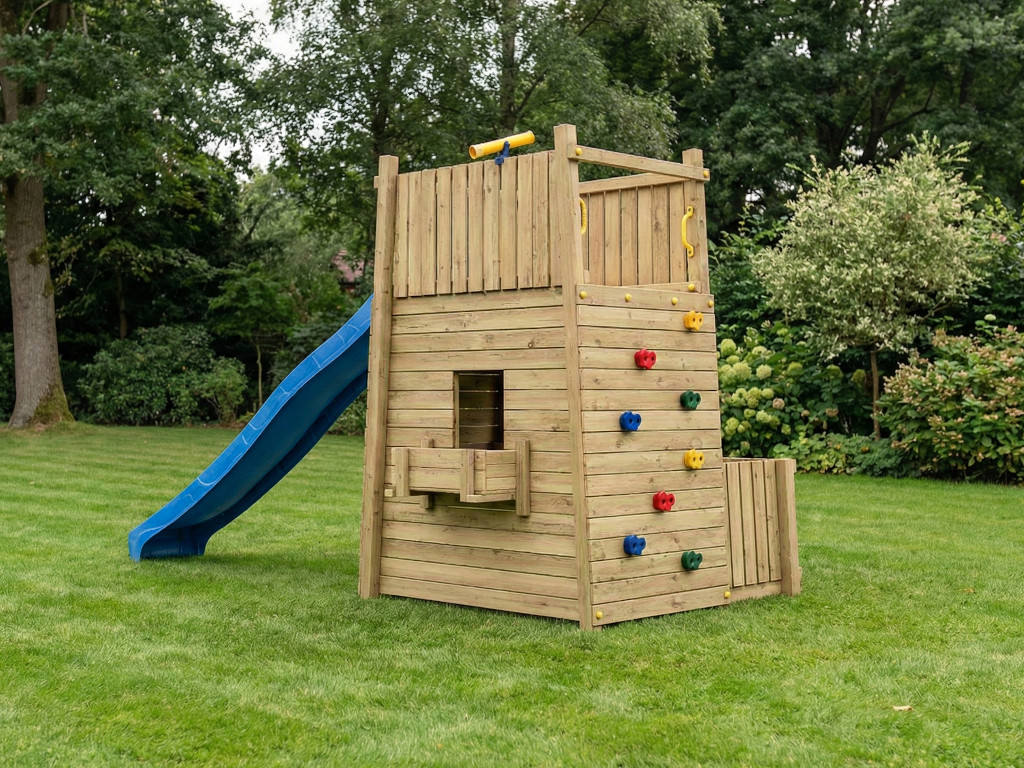 Deze speeltoren is gemaakt van hout. Dit natuurlijke materiaal is de perfecte keuze voor speeltoestellen voor kinderen – duurzaam en gaat lang mee. Voor de productie van dit product is eersteklas grenenhout gebruikt, dat gewaardeerd wordt om zijn duurzaamheid en robuustheid. Het hout is onder druk geïmpregneerd, wat betekent dat conserveringsmiddelen onder hoge druk in het hout worden geperst. Hierdoor dringen ze diep in het hout door en bieden ze optimale bescherming tegen UV-straling, weersinvloeden en insecten. Onder druk geïmpregneerd hout behoeft geen verdere behandeling.
