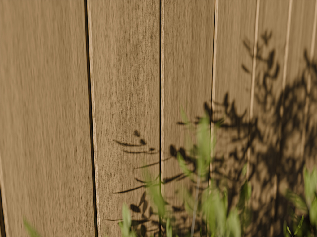 Optisch ziet de gevelbekleding eruit als fijne, individuele ruitprofielen. Het is echter een gesloten bekleding met groef- en tandprofielen. Een unieke look die aangenaam aanvoelend materiaal combineert met intense, willekeurig gecombineerde houtachtige kleuren. Onopvallende bevestiging met schroefkoppen in profielkleur.
